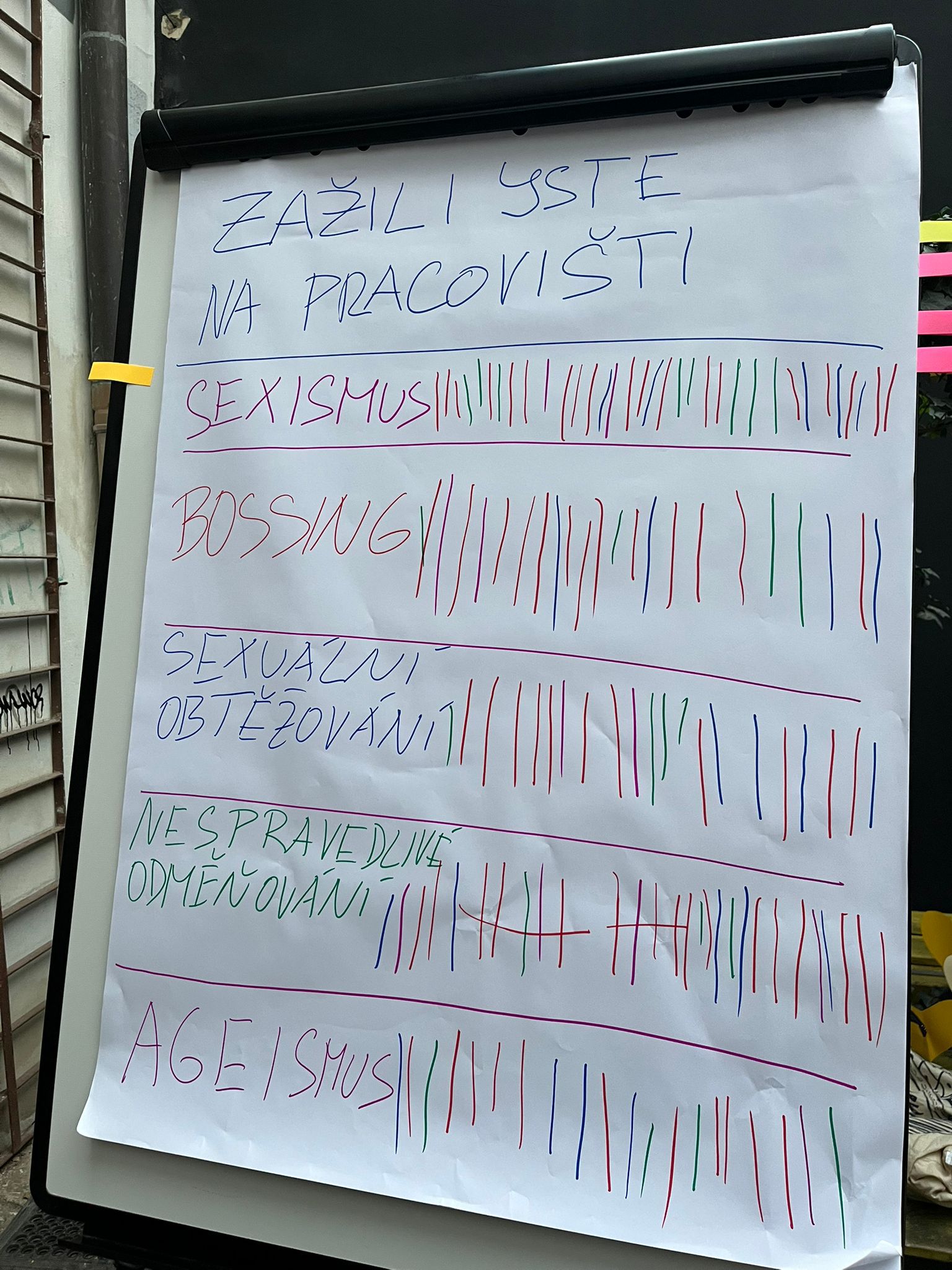 8. října se Mladí odboráři již po 2. zúčastnil akce studentů Pedagogické fakulty Univerzity Karlovy Dvorky. Opět za doprovodu Moniky Horákové předsedkyně odborové organizace Sova. Oslovovali jsme studenty s anketou ohledně pracovních podmínek na pracovišti, jejíž výsledky můžete vidět na obrázku níže. Z přibližně 250 lidí oslovených zažilo 53 sexismus, bossing 41, sexuální obtěžování 32, nespravedlivé odměňování 47 a ageismus 34.